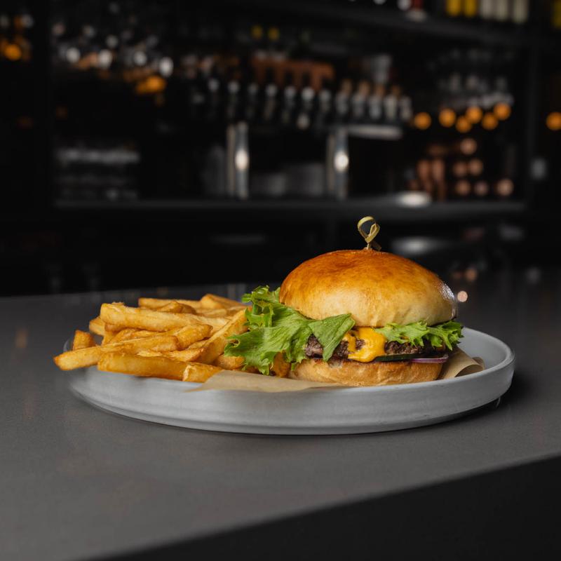 1/2lb grass-fed beef, white cheddar, bacon, tomato jam, pickled onion, lettuce, garlic aioli, house fries