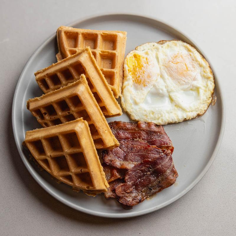 Maple syrup, whipped butter, two eggs any style, choice of bacon or sausage